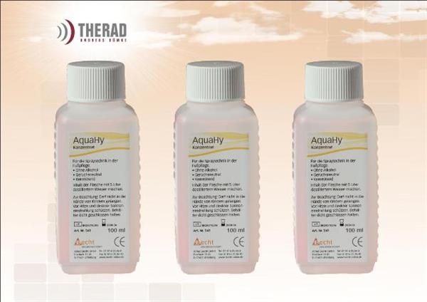 Sprayflüssigkeit für Fußpflegegräte 100 ml Konzentrat NEUHEIT!!!!!!! Endlich ein Konzentrat zum Anmischen von Sprayflüssigkeit für Fußpflegegeräte. Es handelt sich um eine neue Sprayflüssigkeit für Nasstechnikgeräte, die gegenüber Alkohollösungen den Vorteil hat, daß Sie geruchsneutral ist, und als Konzentrat erhältlich ist. Sprayflüssigkeiten auf Alkoholbasis gibt es seit die Nasstechnik in die Fußpflege Einzug genommen hat. Nachteil ist der unangenehme Geruch und das Lösen von Fetten aus der Haut. AquaHy hingegen ist völlig geruchsneutral und löst wesentlich weniger Fette. AquaHy reduziert die Keimbildung im Wasser. Es hemmt die Bildung eines Biofilms (Veralgung). AquaHy ist geruchsneutral und löst Hautfette nur in geringen maße. AquaHy kann mit allen Nasstechnikgeräten verwendet werden. 100 ml AquaHy mit 5l destilliertes Wasser mischen. 20 ml AquaHy mit 1l destilliertes Wasser mischen- Keimtötend - Geruchsneutal - Gering Fettlösend